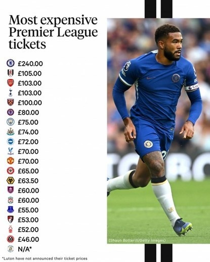 [4] TA列英超球隊票價(jià)排名:切爾西240磅最貴,頭尾相差五倍多. . 2023年8月24日.