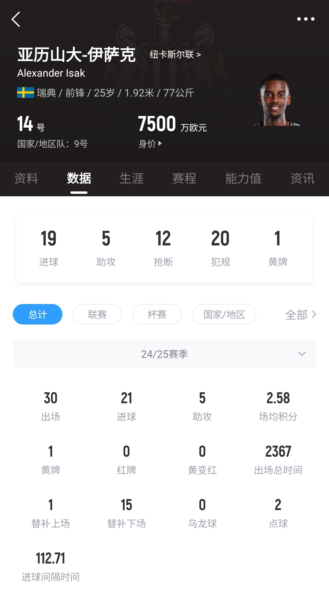 2022年夏窗紐卡花費7000萬(wàn)歐簽下球員。本賽季25歲的伊薩克為紐卡出戰30場(chǎng)比賽,打進(jìn)21球并有5次助攻,目前球員德轉身價(jià)7500萬(wàn)歐。