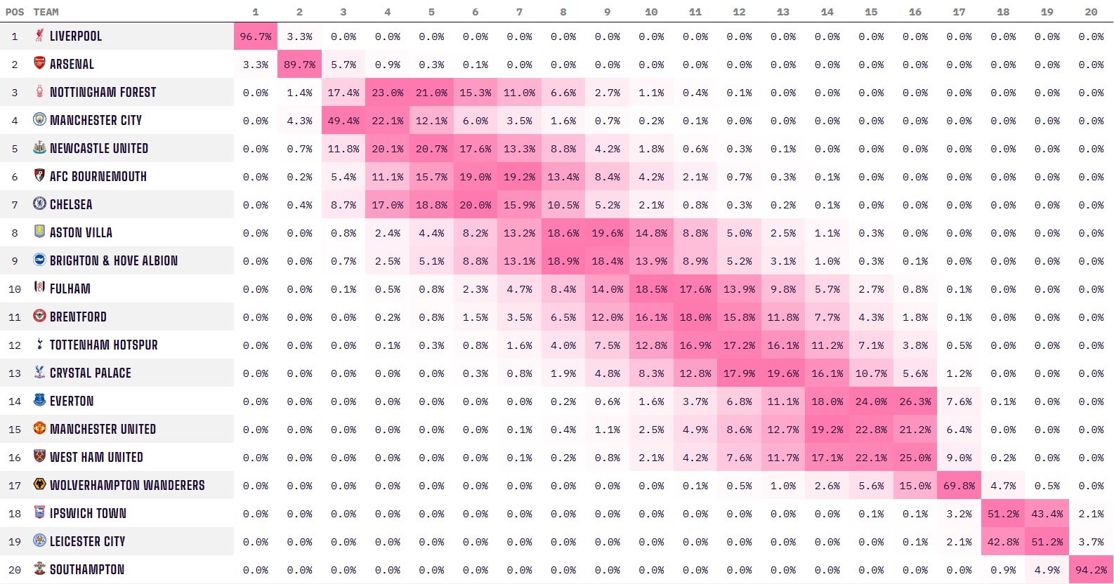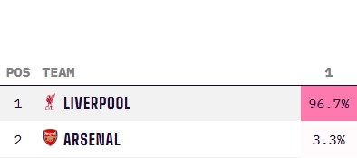 阿森納的奪冠幾率則一場(chǎng)下降了十多個(gè)百分點(diǎn),僅剩3.3%。曼城敗給利物浦后,最終0.1%的奪冠希望也歸于0。