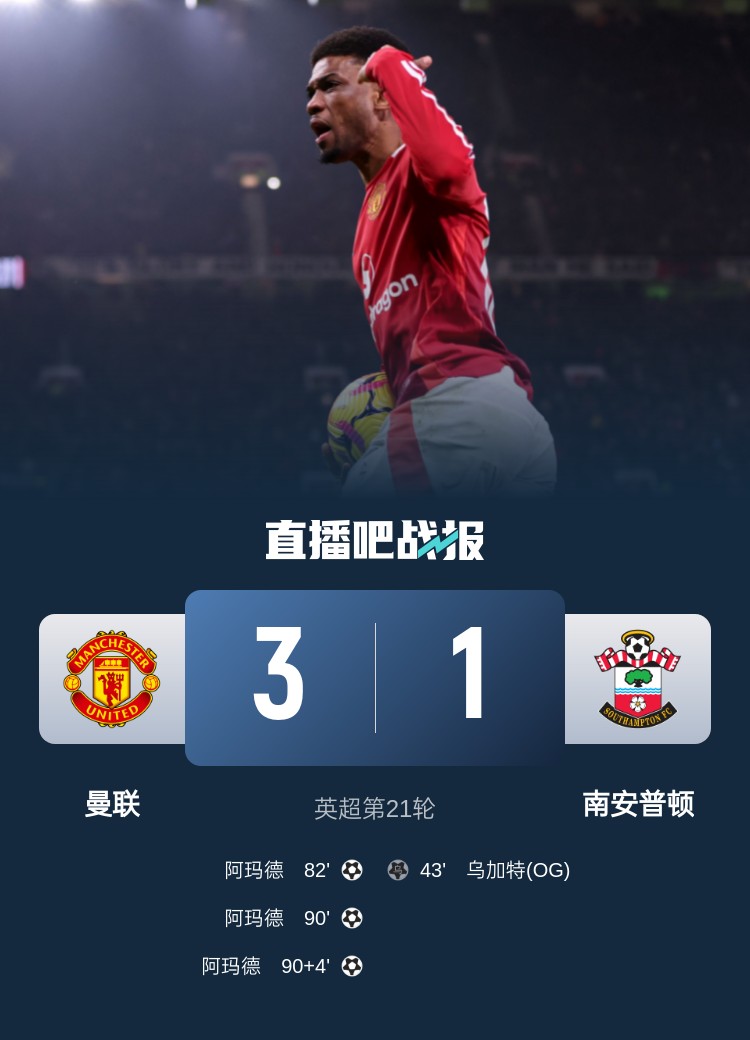 英超第21輪,南安普頓一直到81分鐘還保持1-0領(lǐng)先,隨后阿瑪德連進(jìn)三球逆轉比賽。