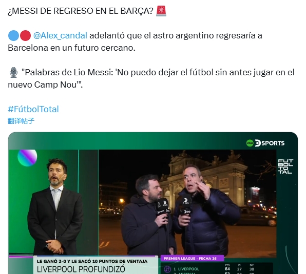 02月25日訊 記者Alex candal在節目中透露,梅西即將重返巴塞羅那,目前效力于邁阿密?chē)H的阿根廷天王對新諾坎普球場(chǎng)非常感興趣。