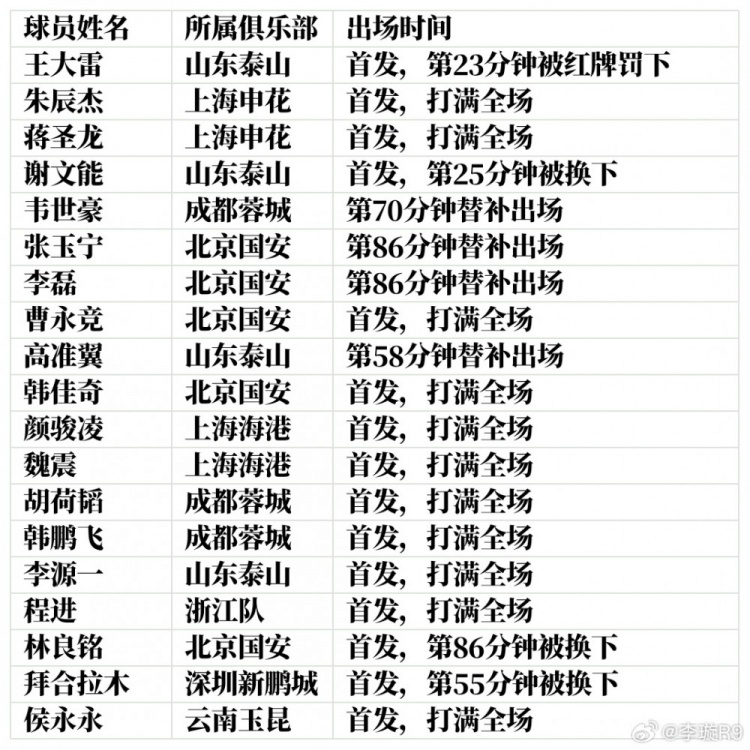 李璇在個(gè)人微博中寫(xiě)道:參考國家隊1月份的集訓名單,統計了一下2025賽季中超首輪國腳的出場(chǎng)情況,圖為有出場(chǎng)記錄的球員,未出場(chǎng)球員(共13人,費南多因不在中超聯(lián)賽可忽略不計):蹇韜、楊澤翔、吾米提江-玉蘇普、吳少聰、徐皓陽(yáng)、汪海健、王上源、黃政宇、買(mǎi)烏郎-米吉提、王子銘、楊立瑜、陶強龍、費南多。
