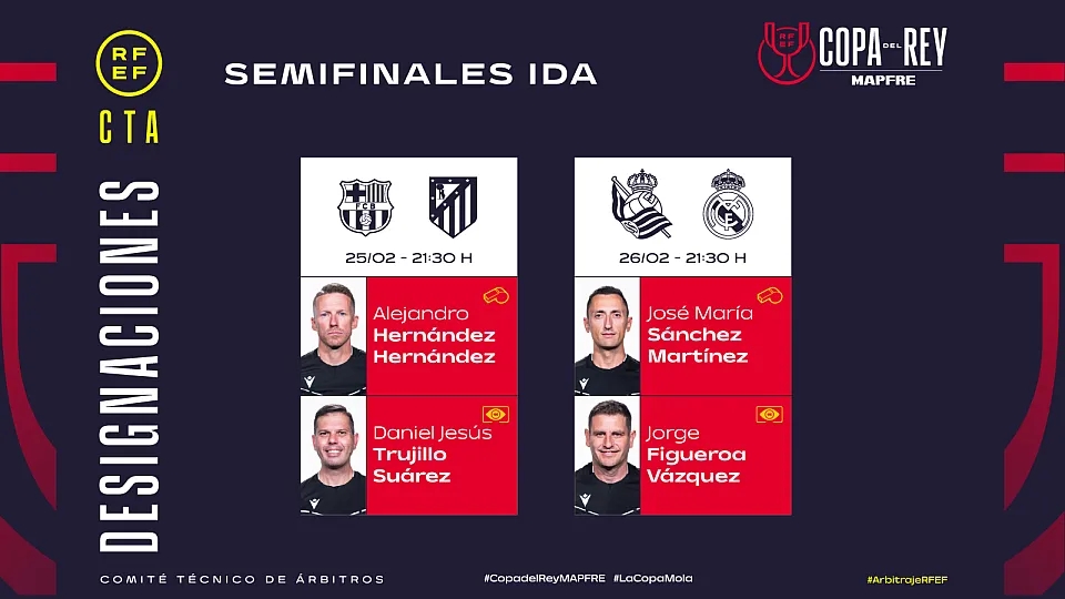 2月25日訊 西班牙足協(xié)日前公布了國王杯兩場(chǎng)半決賽首回合的裁判名單,具體如下: