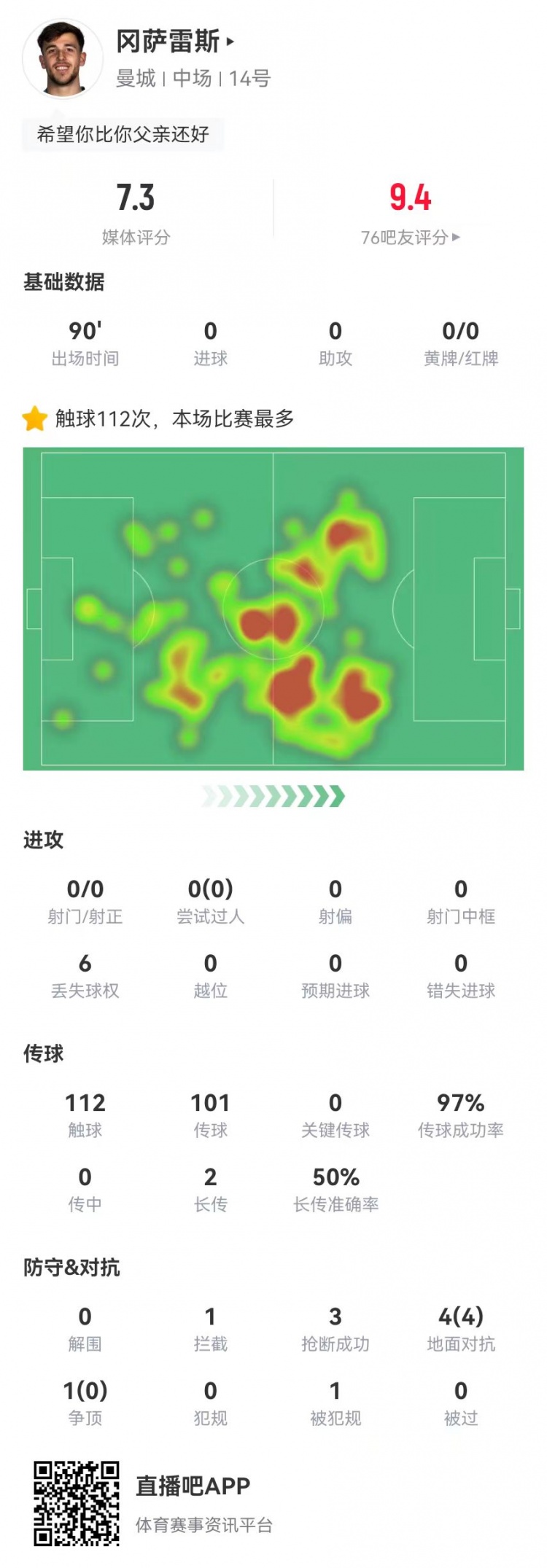 岡薩雷斯本場(chǎng)比賽觸球達到112次,是全場(chǎng)最多的球員。他的傳球成功率也有97%,同樣是全場(chǎng)最高。在防守端他也有著(zhù)1攔截3搶斷和4次對抗全成功的戰績(jì),僅有爭頂失敗一次。