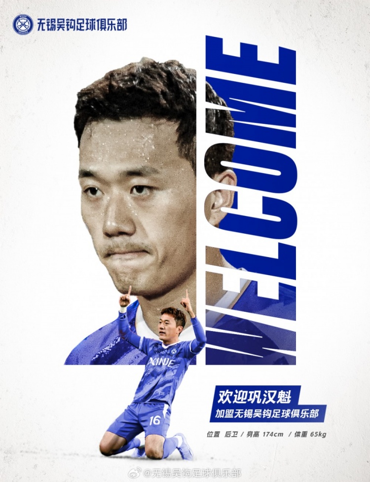 我們在此鄭重宣布,經(jīng)雙方協(xié)商一致,球員鞏漢魁加盟無(wú)錫吳鉤足球俱樂(lè )部。2025賽季,他將為無(wú)錫而戰!