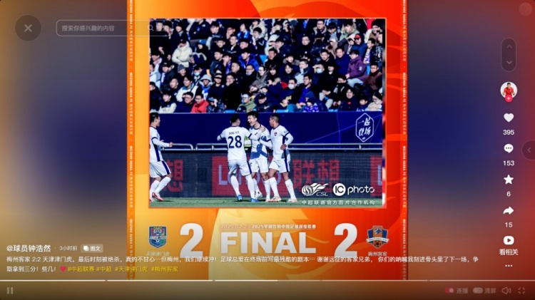 在個(gè)人社媒,鐘浩然總結首輪比賽,他寫(xiě)道:“梅州客家2-2天津津門(mén)虎。最后時(shí)刻被絕殺,真的不甘心…但梅州,我們繼續沖!足球總愛(ài)在終場(chǎng)前寫(xiě)最殘酷的劇本…謝謝遠征的客家兄弟,你們的吶喊我刻進(jìn)骨頭里了。下一場(chǎng),爭取拿到三分!些幾!”