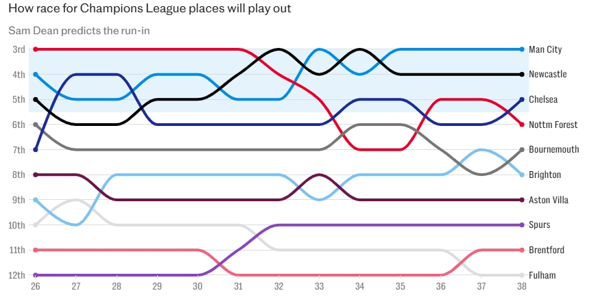 02月26日訊 英超有望在下賽季獲得5個(gè)歐冠席位,《每日電訊報》撰文對最后排在前5的球隊進(jìn)行了預測。曼城、紐卡、切爾西將排在三四五名。