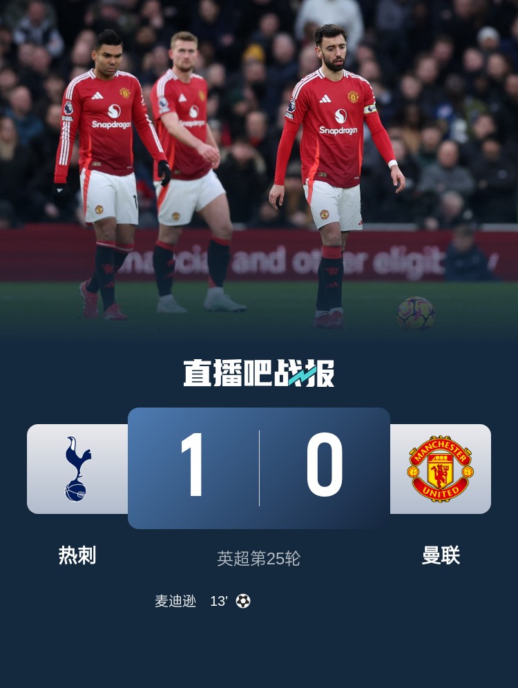 英超第25輪,熱刺主場(chǎng)1-0曼聯(lián),麥迪遜制勝,加納喬失良機。