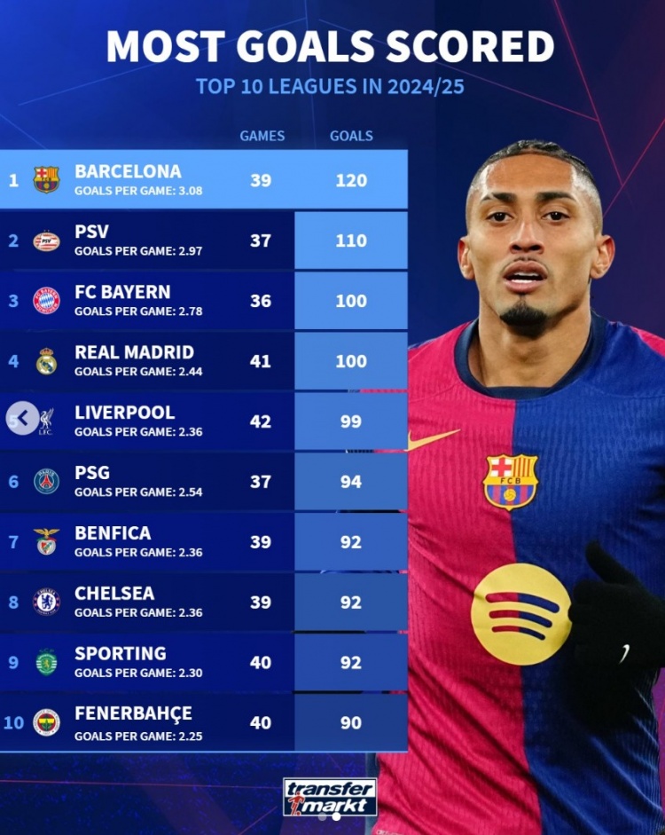 2月26日訊 德轉盤(pán)點(diǎn)了本賽季歐洲前十聯(lián)賽球隊各項賽事進(jìn)球榜,其中巴薩39場(chǎng)120球居首,以下為具體榜單:
