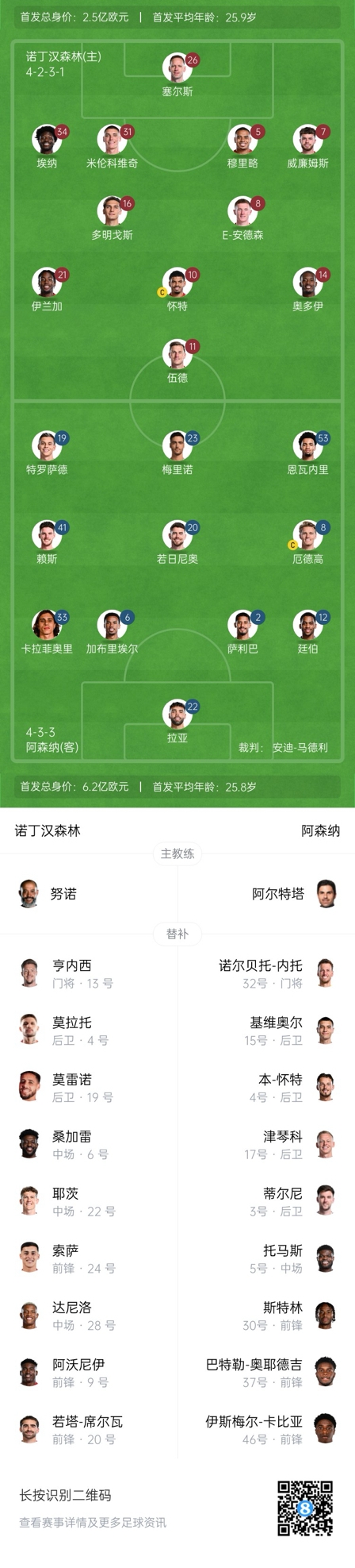 諾丁漢森林替補:13-亨內西、4-莫拉托、19-阿萊克斯-莫雷諾、6-桑加雷、22-耶茨、28-達尼洛、9-阿沃尼伊、20-若塔-席爾瓦、24-拉蒙-索薩