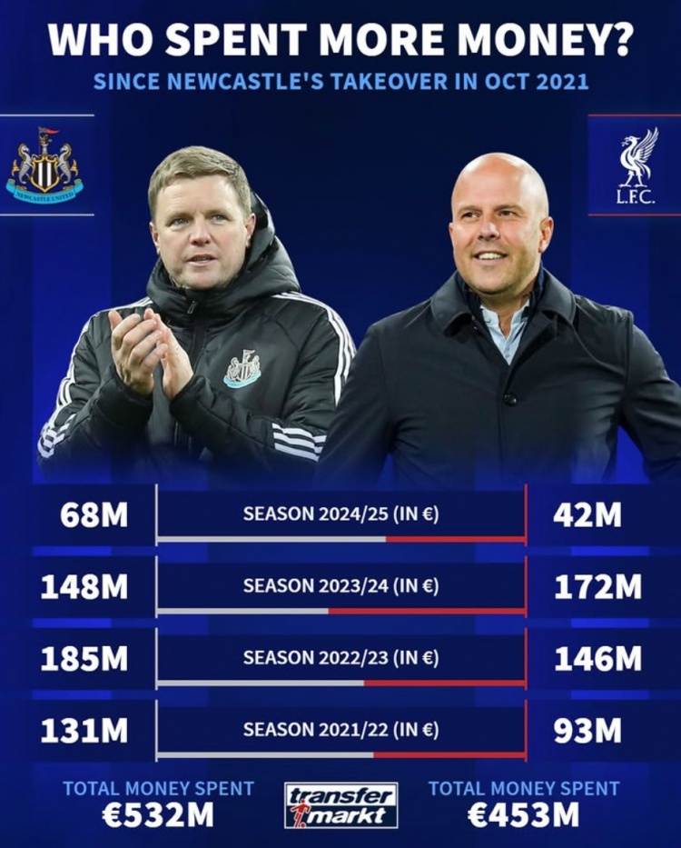 23-24賽季:紐卡1.48億歐元,利物浦1.72億歐元