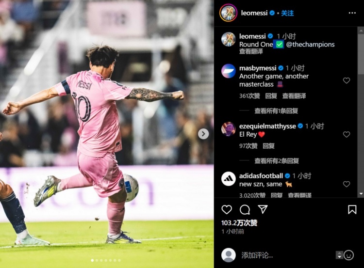 梅西本場(chǎng)打進(jìn)一記凌空抽射,賽后他在社媒曬出比賽照片,并配文:第一輪?。