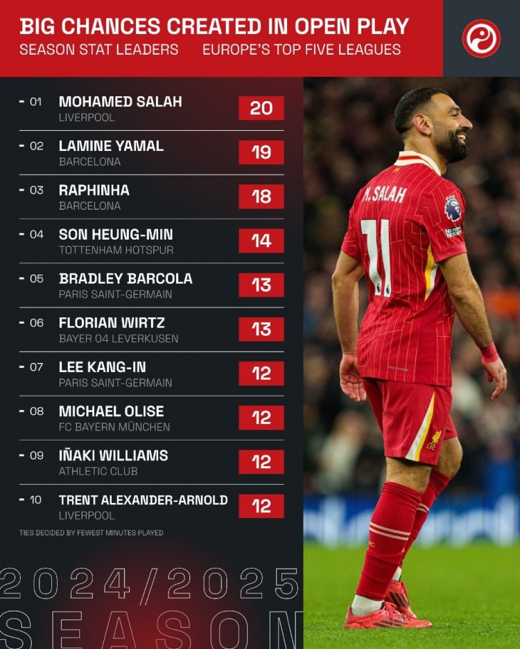 2月27日訊 數據媒體Squawka統計了五大聯(lián)賽本賽季運動(dòng)戰創(chuàng )造絕佳機會(huì )次數榜單,薩拉赫20次排名第一,巴薩的亞馬爾和拉菲尼亞排名第二和第三。