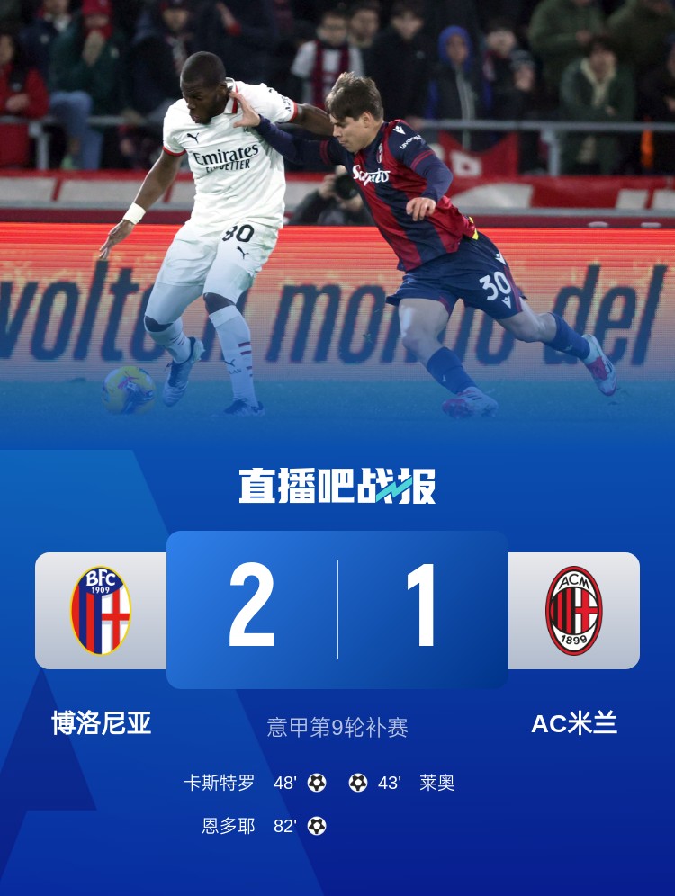 萊奧破門(mén),米蘭1-2遭博洛尼亞逆轉,意甲兩連敗跌至第8名。