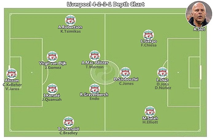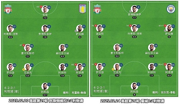 四天內兩戰強敵,利物浦的首發(fā)陣容只有1處變化,斯洛特使用了兩種截然不同的陣型和打法。