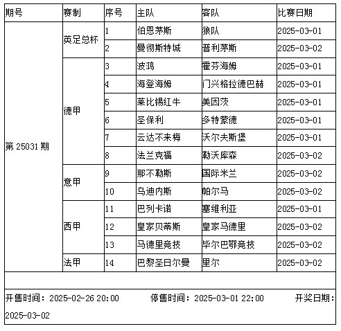 本周末,英超因為足總杯而暫停。下周中又將有歐戰各級賽事淘汰賽,強隊紛紛面臨雙線(xiàn)作戰。傳足勝負彩第25031期涉及的球隊中,多特蒙德、勒沃庫森、皇家馬德里、巴塞羅那、巴黎圣日爾曼和里爾都要征戰歐冠淘汰賽;法蘭克福、畢爾巴鄂競技征戰歐聯(lián)淘汰賽;皇家貝蒂斯將出戰歐協(xié)淘汰賽。
