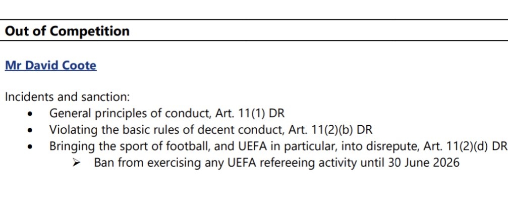 將足球運動(dòng),特別是歐足聯(lián)的聲譽(yù)置于受損的境地→禁止從事任何歐足聯(lián)裁判活動(dòng),直至2026年6月30日