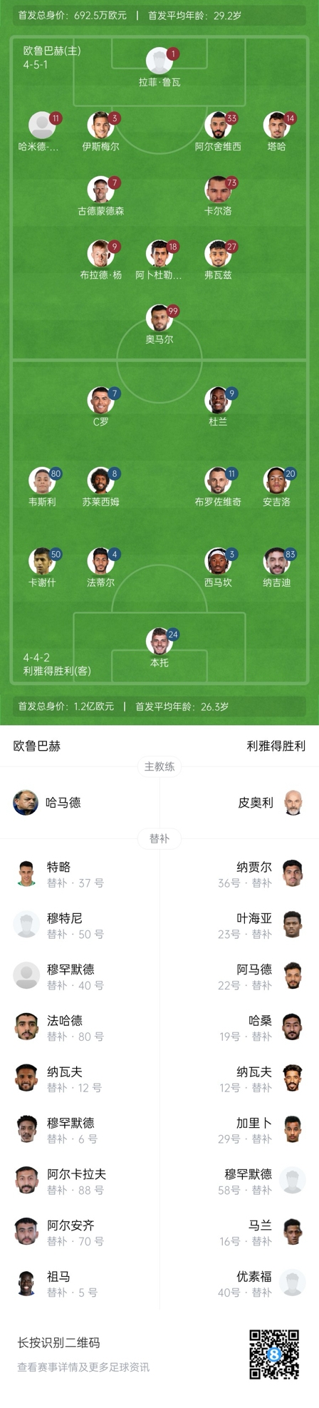 利雅得勝利替補:36-納賈爾、12-納瓦夫、23-葉海亞、22-阿馬德、19-哈桑、29-加里卜、58-穆罕穆德、16-馬蘭、40-尤素夫